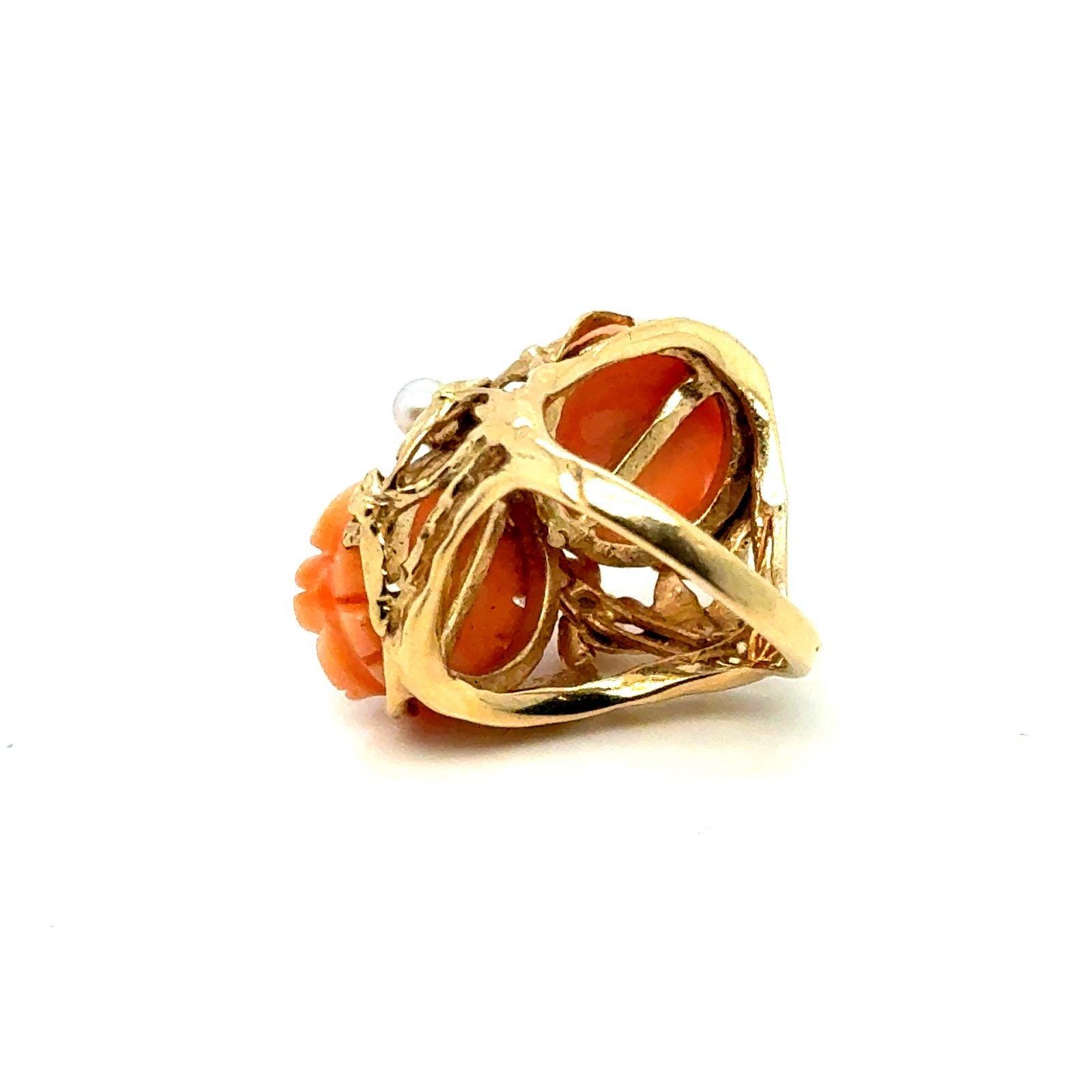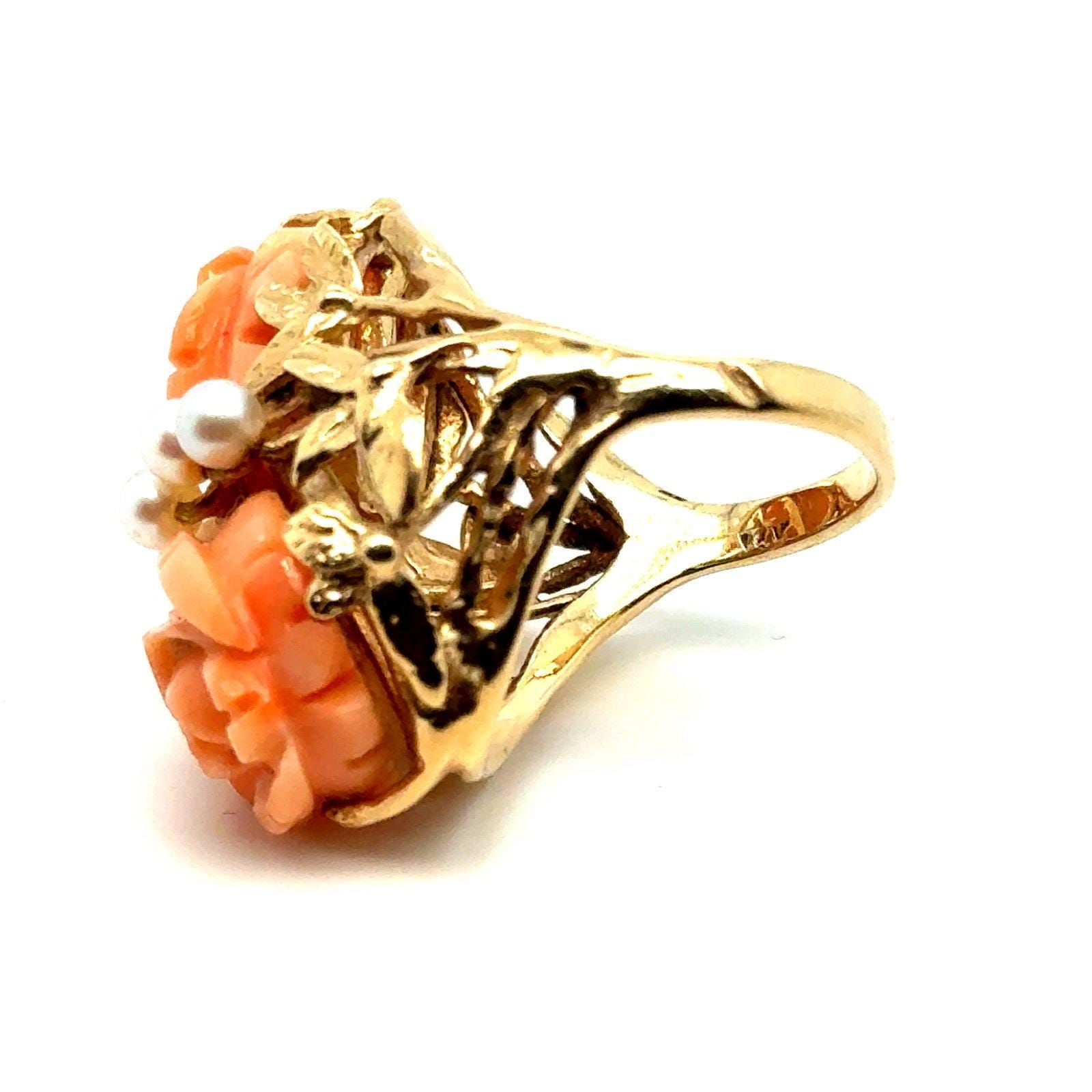 Vintage 14K Gold Carved Roses Seed Pearls Ring