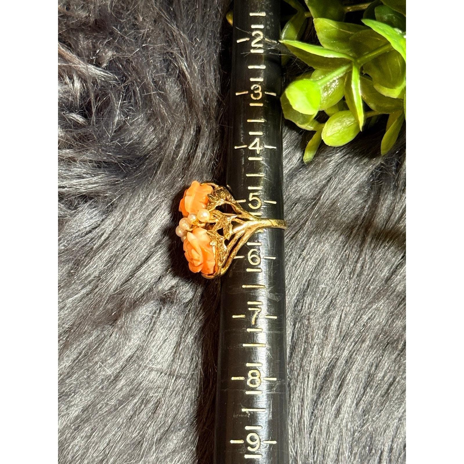 Real 14K Yellow Gold Carved Roses Seed Pearls Ring , REAL GOLD, NOT GOLD PLATED OR GOLD FILLED.