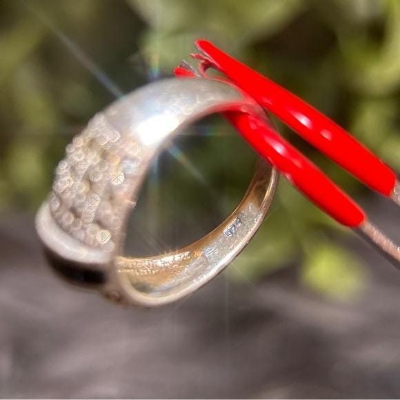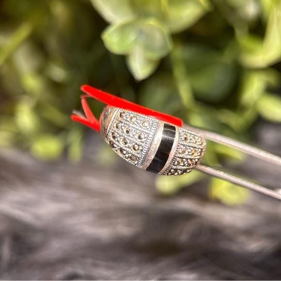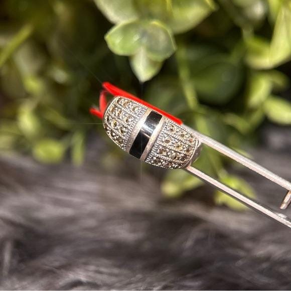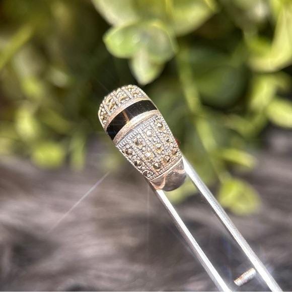 Sterling silver 925 band with detailed marcasite pavé. Center black onyx inlay adds contrast. Timeless, versatile design. Great statement ring.