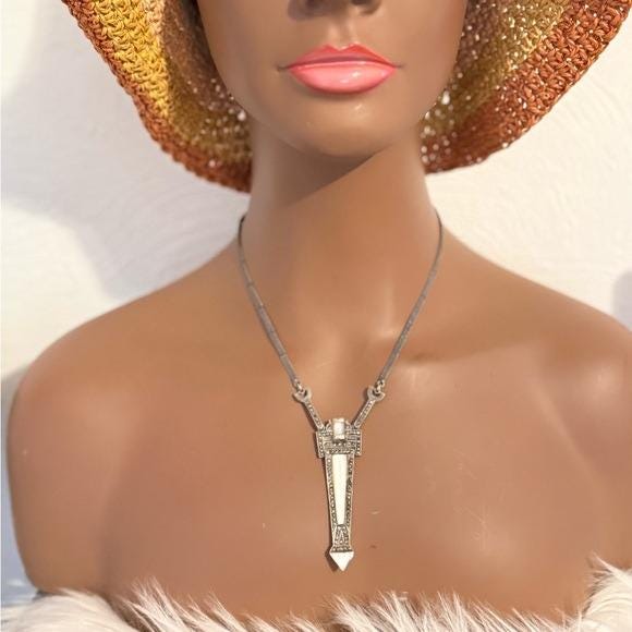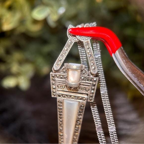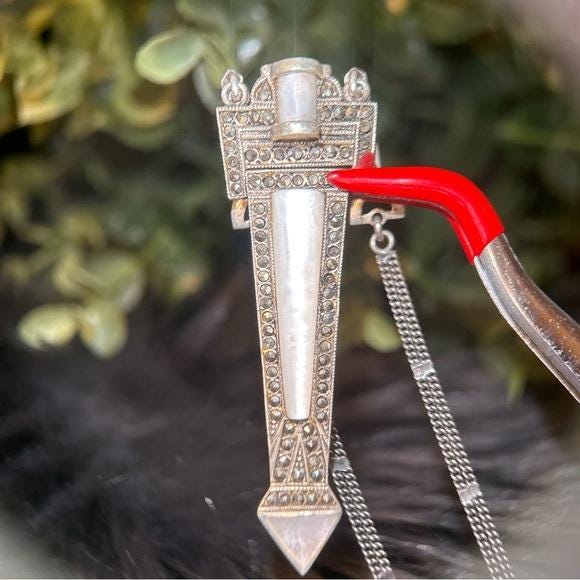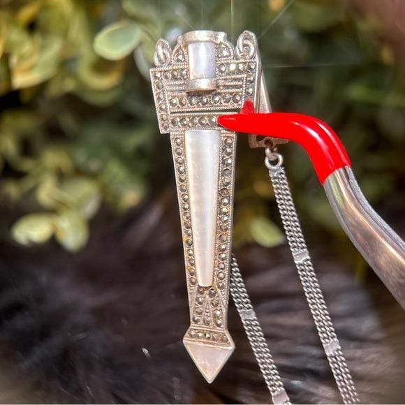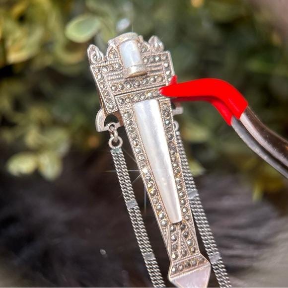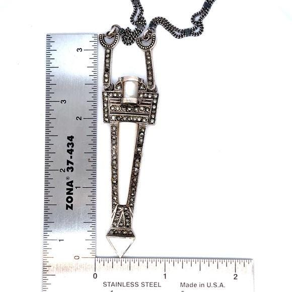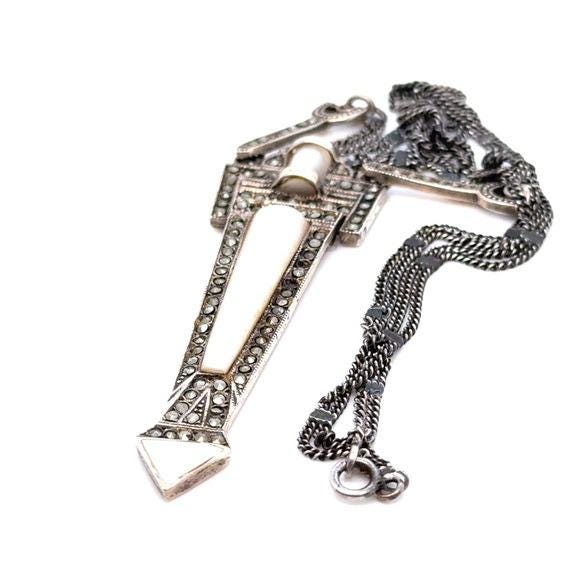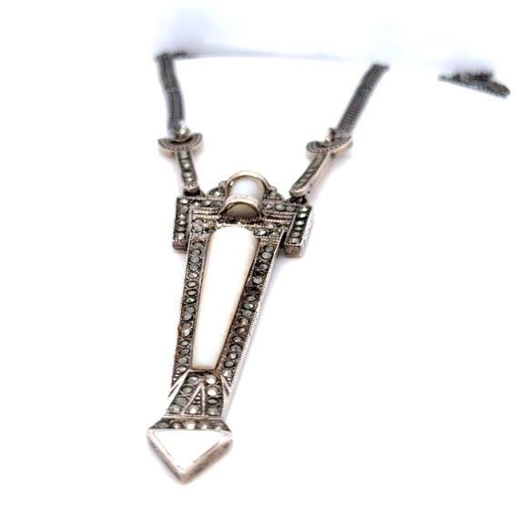 Elegant Sterling silver MOP drop pendant necklace with marcasite accents. Features an art deco-inspired geometric design for a refined look. Perfect for dressing up evening or work outfits. Lightweight and easy to wear for everyday style.
